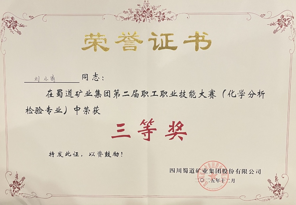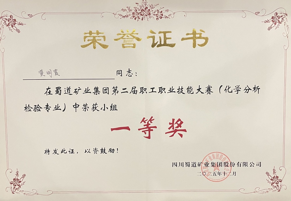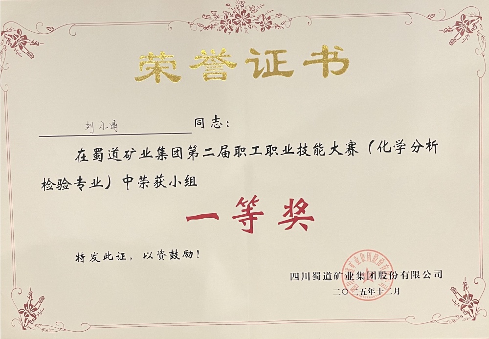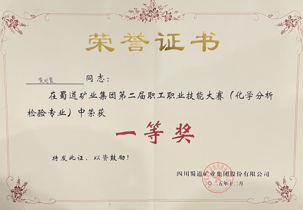 12月19日,蜀道矿业集团第二届职工职业技能大赛(化学分析检验专业)圆满落幕。本次大赛围绕化学检验员岗位核心能力设置专业知识测试,聚焦化学分析检测中的关键环节——标准溶液配制与标定、数据处理与分析等典型工作任务,汇聚了来自7家公司的12支队伍。经过为期两天的层层角逐,中国·必威(bw·西汉姆联)中文官方网站三号矿山技术质量科黄明霞、刘小晴凭借扎实的理论功底和规范的实操技能斩获团队一等奖。同时,黄明霞获个人一等奖,刘小晴获个人三等奖。